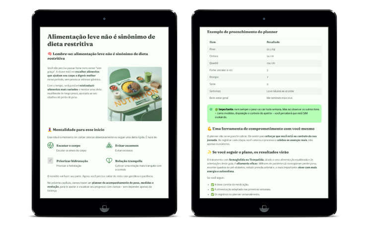 O e-book reúne, em um só lugar, tudo o que você precisa para finalmente ver o tratamento funcionar: acelerar seus resultados, reduzir os efeitos colaterais que mais atrapalham, evitar o reganho de peso e parar de gastar com tentativas frustradas. É a clareza que faltava e o passo a passo seguro que torna seu resultado inevitável. Por apenas R$ 39,00.